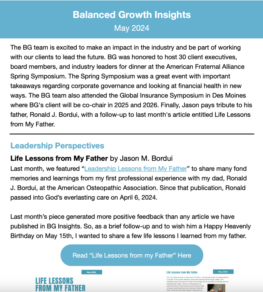 The BG team is excited to make an impact in the industry and be part of working with our clients to lead the future. BG was honored to host 30 client executives, board members, and industry leaders for dinner at the American Fraternal Alliance Spring Symposium. The Spring Symposium was a great event with important takeaways regarding corporate governance and looking at financial health in new ways. The BG team also attended the Global Insurance Symposium in Des Moines where BG’s client will be co-chair in 2025 and 2026. Finally, Jason pays tribute to his father, Ronald J. Bordui, with a follow-up to last month’s article entitled Life Lessons from My Father.