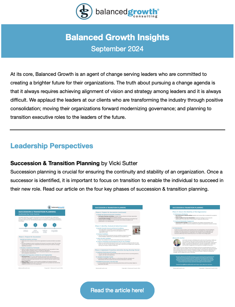 At its core, Balanced Growth is an agent of change serving leaders who are committed to creating a brighter future for their organizations. The truth about pursuing a change agenda is that it always requires achieving alignment of vision and strategy among leaders and it is always difficult. We applaud the leaders at our clients who are transforming the industry through positive consolidation; moving their organizations forward modernizing governance; and planning to transition executive roles to the leaders of the future.